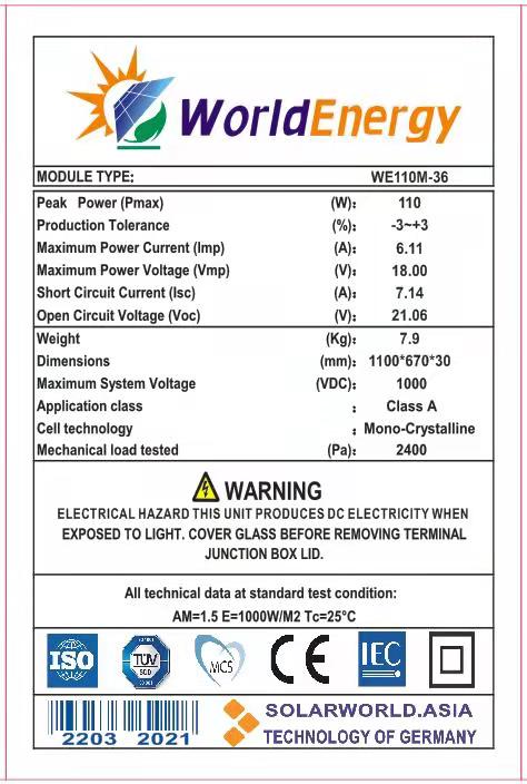 Thông số kỹ thuật TẤM PIN NĂNG LƯỢNG MẶT TRỜI MONO 110W WORLDENERGY